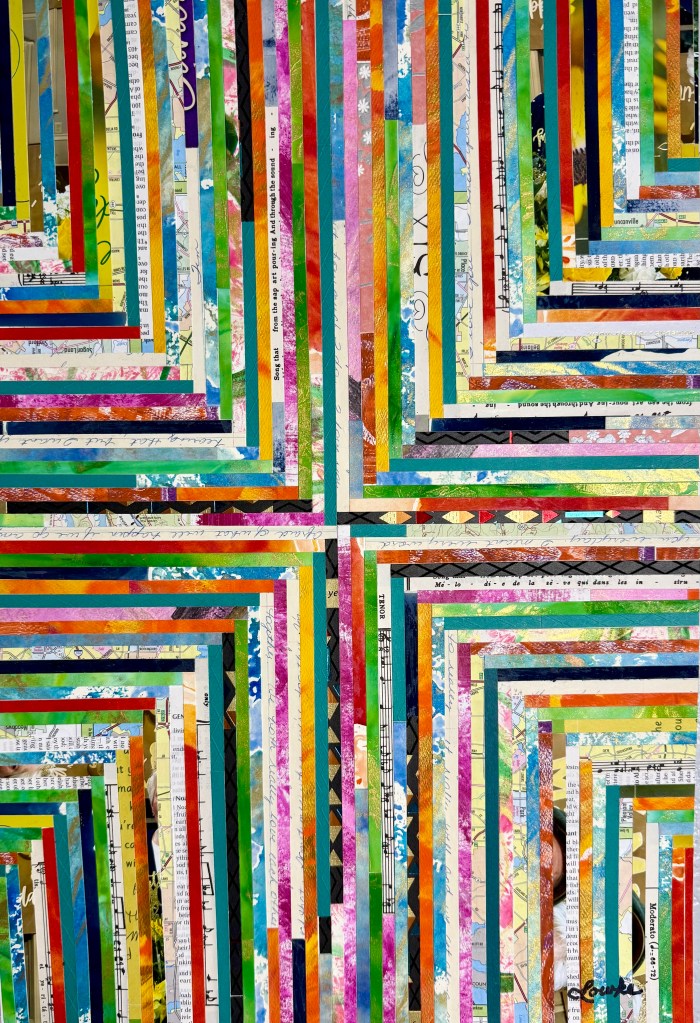 Artist Statement: A vast portion of my 2010 summer was spent dealing with the loss of my father. It was amazing to me to see, hear and feel the care and love that our community felt for my family and I during this time of sorrow and one tangible was the written condolences I received. In looking at these as an artist, I was fascinated by the color palette, textures and text that was incorporated both from the commercial to the individual. Deconstructing and reassembling only the meaningful pieces created an image of layers that personally reflects the many individuals who took time to express grief, prayers, sympathy and joy for the life lived. Important to me, the meaning of the handwritten messages and thoughts conveyed infuse this piece with personal, emotional and spiritual context as a son, father, husband, artist as a symbol of life.