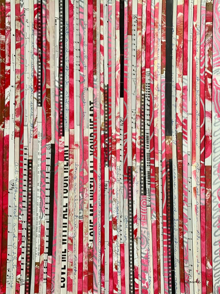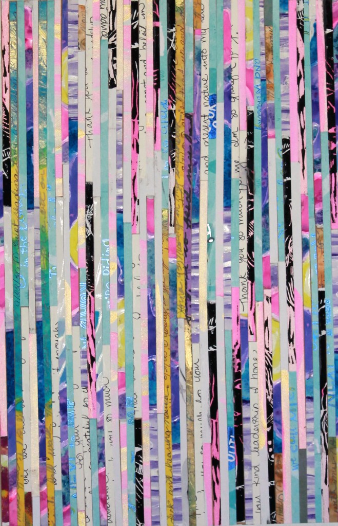 Artist Statement: A vast portion of my 2010 summer was spent dealing with the loss of my father. It was amazing to me to see, hear and feel the care and love that our community felt for my family and I during this time of sorrow and one tangible was the written condolences I received. In looking at these as an artist, I was fascinated by the color palette, textures and text that was incorporated both from the commercial to the individual. Deconstructing and reassembling only the meaningful pieces created an image of layers that personally reflects the many individuals who took time to express grief, prayers, sympathy and joy for the life lived. Important to me, the meaning of the handwritten messages and thoughts conveyed infuse this piece with personal, emotional and spiritual context as a son, father, husband, artist as a symbol of life.